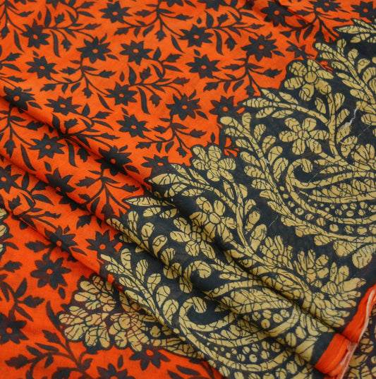 Indian Vintage Sari Black & Orange Printed Pure Cotton Saree Craft Fabric Soft Floral 5Yd Sarong Wrap Boho Kimono Soft Dress making Quilting