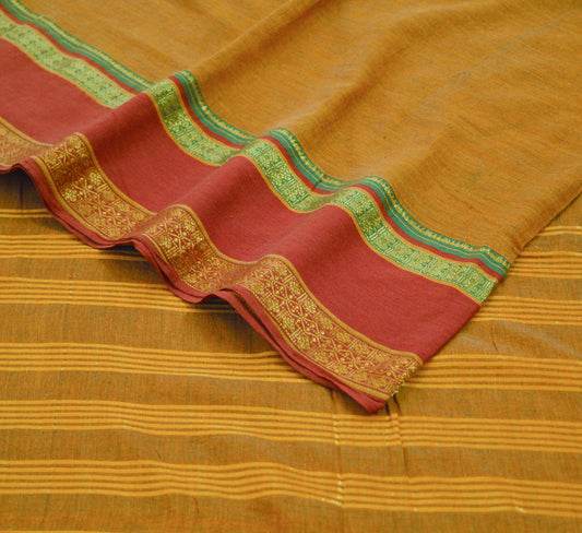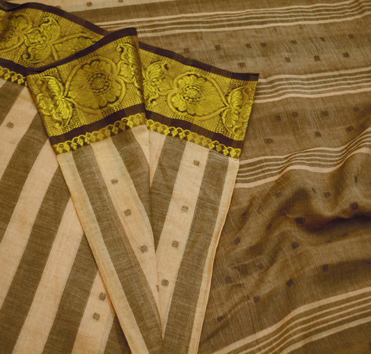 Vintage Sari Brown & Beige Pure Cotton Hand Woven Saree Golden Zari 5Yard Soft Floral Golden Zari