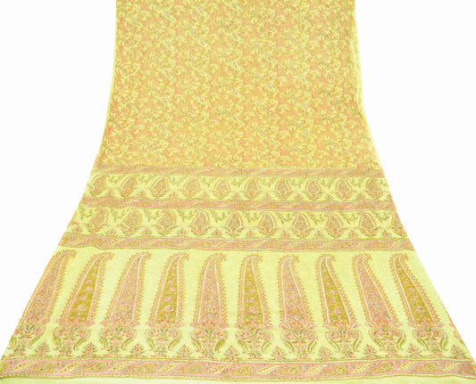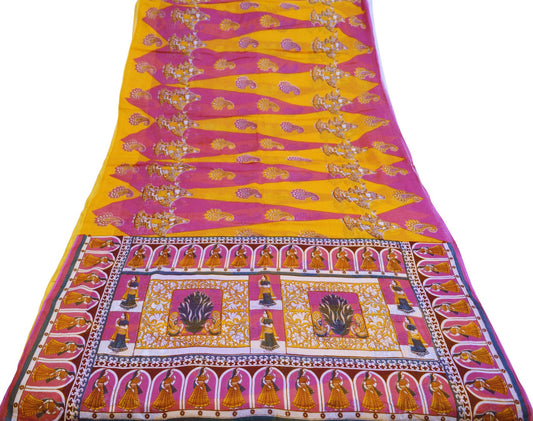 Indian Vintage Sari Yellow Hand Embroidered Printed Sari 100% Pure Silk Sarees Craft Fabric 5yd Soft Zari Sequins Dress making Quilting Used