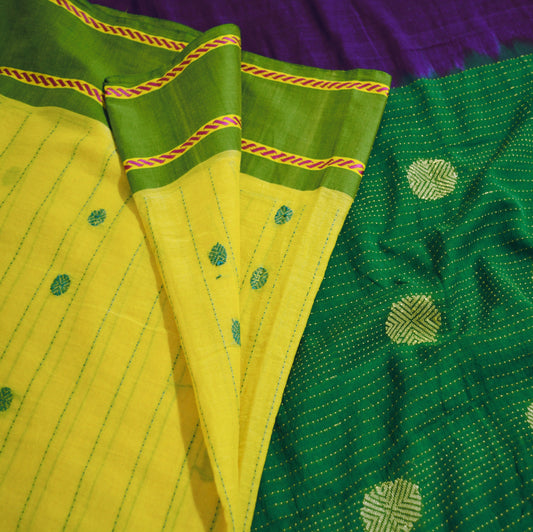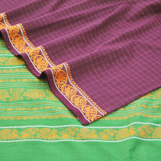 Indian Vintage Sari Purple & Green Pure Cotton Hand Woven Baluchari Saree 5yard Ethnic Fringes Peacock Fringes