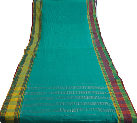 Vintage Sari Green Pure Cotton Hand Woven Saree Zari 6Yard Soft Floral Ethnic Fringes