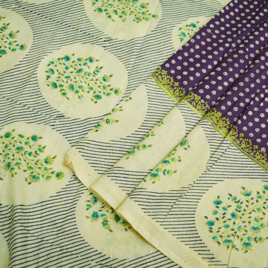 Indian Vintage Sari Purple & Ivory Pure Cotton Printed Saree 5Yd Craft Fabric Sewing Sarong Wrap Boho Floral Quilting crafting dressmaking