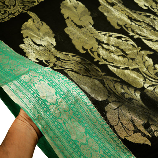 Vintage Sari Black Pure Cotton Hand Woven Saree Golden Zari 5Yard Floral Golden Zari
