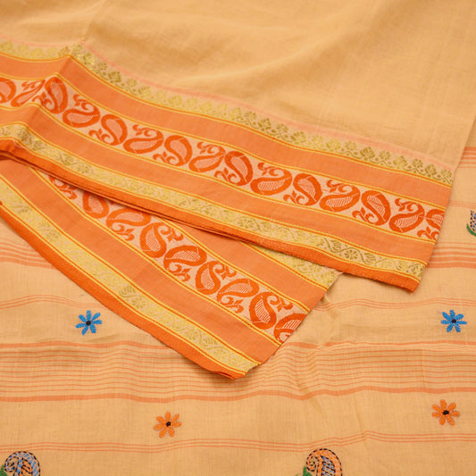 Indian Vintage Sari Peach Pure Cotton Hand Embroidered Saree Kantha Fabric 6yard Sewing Floral Soft Zari