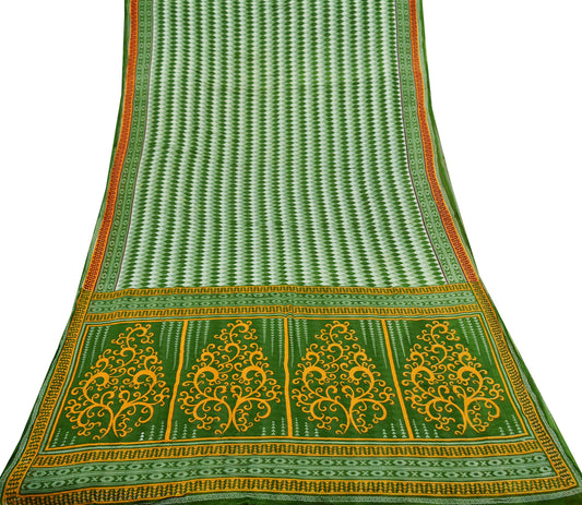 Indian Vintage Sari Green & White Printed Pure Cotton Saree Craft Fabric 5Yd Soft Sewing Sarong Wrap Boho Geometric Upcycle used Quilting