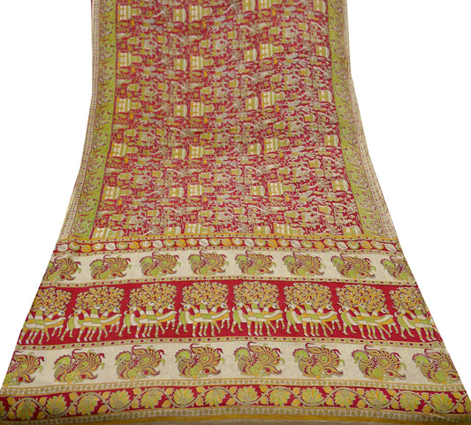 Indian Vintage Sari Red Pure Cotton Kalamkari Sarees 5Yd Craft Fabric Sewing Soft Peacock Ethnic Quilting Upcycle Sarong Used Dress Making