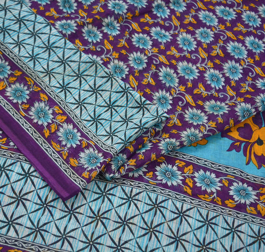 Indian Vintage Sari Purple & Blue Printed Sarees Pure Cotton Craft Fabric 5Yd Soft Sewing Sarong Wrap Boho Upcycle Quilting Crafting Used