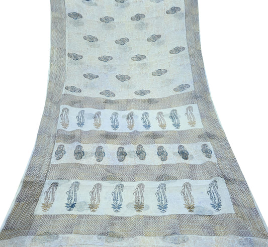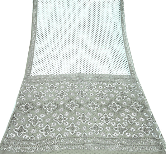 Indian Vintage White & Gray Printed Pure Cotton Saree | 5 Yards | Fabric for Sewing, Crafting, Quilting, Upcycling, Dressmaking, Boho