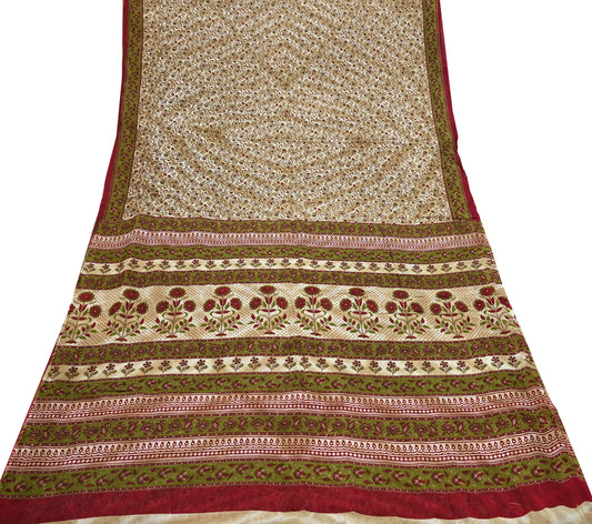 Indian Vintage Sari Beige & Green Pure Cotton Printed Sarees Craft Fabric Soft 5Yd Sarong Wrap Boho Fabric Kimono Quilting Crafting Upcycle