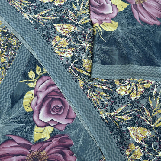 Indian Vintage Gray Sarees Moss Crepe Printed Sari 5yd Sewing Floral Soft Craft Fabric DressMaking For Crafting Quilting Upcycle