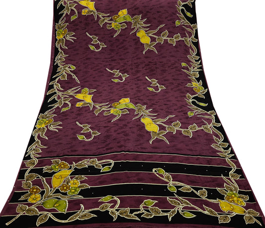Indian Vintage Saree Purple & Brown Moss Crepe Printed Sari 6 Yards Floral Soft Fabric for Sewing, Dressmaking, Crafting, Quilting