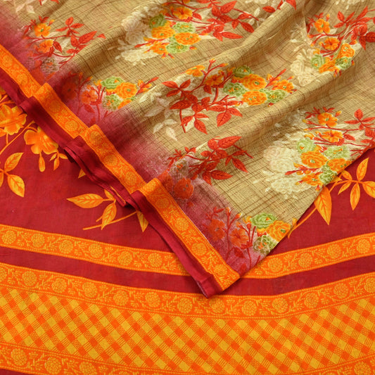 Indian Vintage Red & Beige Saree Printed 100% Pure Cotton Sari Craft Fabric 5Yd Soft Sewing Sarong Wrap Dress Making Quilting Crafting