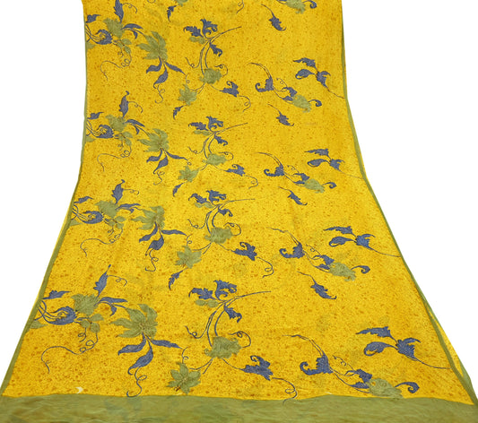 Indian Vintage Yellow Saree Pure Georgette Silk Hand Embroidered Printed Sari Craft Fabric Sewing 5Yd Soft Light Dress Making Floral