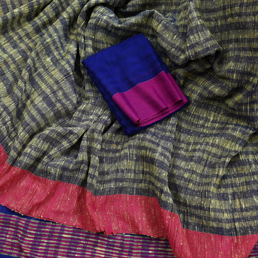 Indian Vintage Sari Beige & Blue Pure Cotton Hand Woven Sarees Craft Fabric 5yd Ethnic Crafting Quilting Dress Making Matching Blouse Fabric