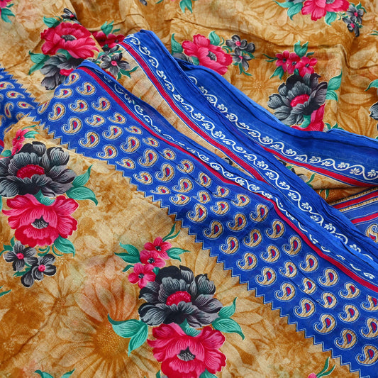 Indian Vintage Saffron & Blue Saree Printed Pure Cotton Sari Craft Fabric 5Yd Sewing Soft Sarong Wrap Boho Floral Quilting Crafting