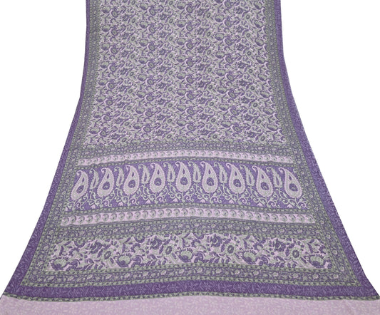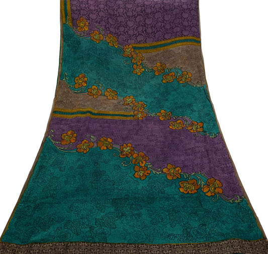 Indian Vintage Saree Purple & Green 100% Pure Georgette Silk Printed Sari Sewing 5yd Craft Fabric Soft Floral Dress Designing for Crafting
