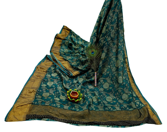 Indian Vintage Green Saree Block Printed Sari Pure chanderi Silk Sari Craft Fabric 5Yd Floral Soft Zari Dress making Bollywood saree Birds
