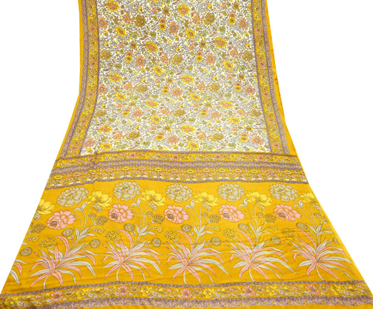 Indian Vintage Mustard & Ivory Sarees Moss Crepe Printed Sari 5yd Sewing Floral Soft Craft Fabric DressMaking For Crafting Quilting Upcycle