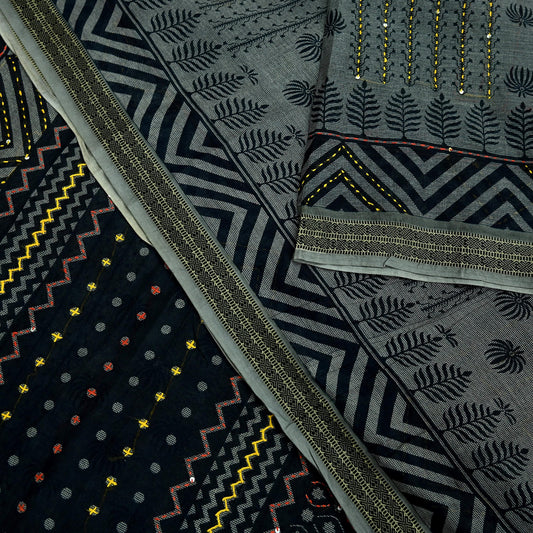 Indian Vintage Sari Black Pure Cotton Hand Embroidered Sarees Kantha Fabric 5yd Sewing Floral Soft Dress making Crafting Quilting