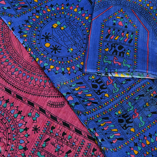 Indian Vintage Blue & Pink Saree Warli Print Pure Cotton Sari Craft Fabric 5Yd Soft Sewing Sarong Wrap Boho Dress making Crafting Quilting