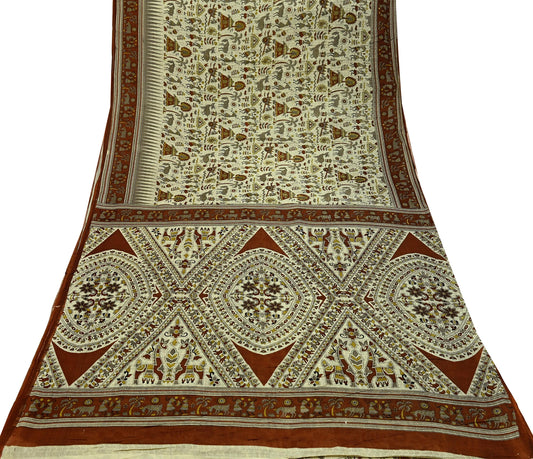Indian Vintage Brown & Beige Saree Warli Print Pure Cotton Sari Craft Fabric 5Yd Soft Sewing Sarong Wrap Boho Dress making Crafting Quilting