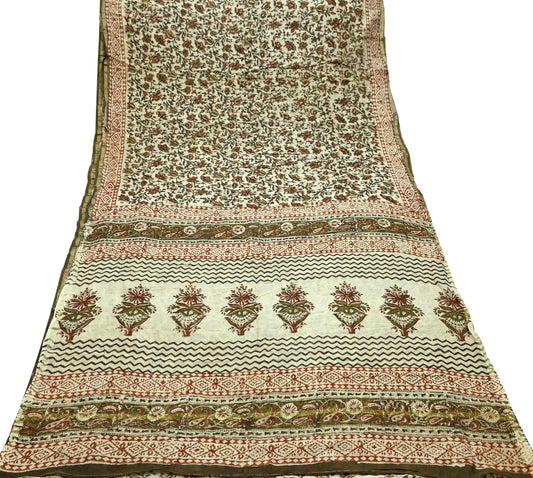 Indian Vintage Sari Ivory & Maroon Block Printed Pure Cotton Saree Fabric Soft Floral 5Yd Sarong Wrap Boho Fabric Kimono Soft