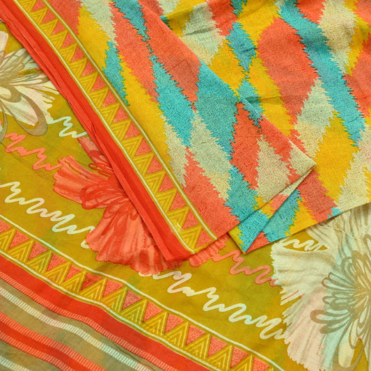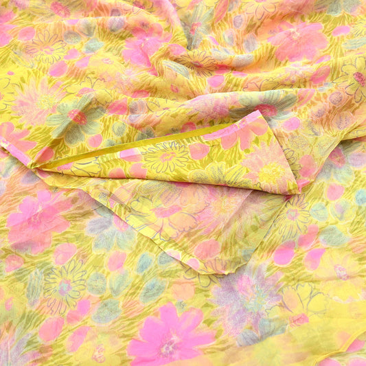 Indian Women Vintage Yellow Saree Pure Chiffon Silk Printed Sari Craft Fabric Sewing 5Yd Soft Light Sari Dress Making Floral