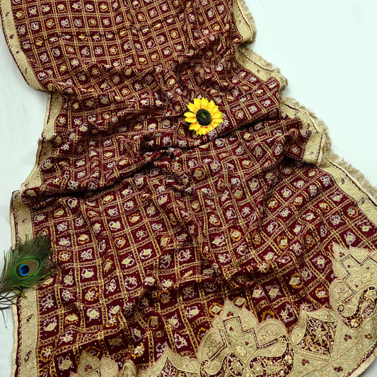 Indian Vintage Heavy Bridal Maroon Dupatta Pure Cotton Long Stole Hand Embroidered Bandhani Gharchola Scarves Wedding/Party Wear Paisley