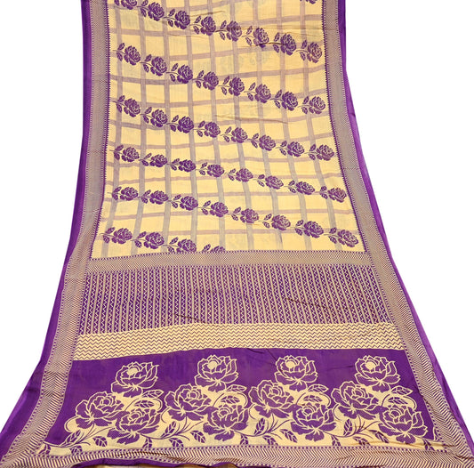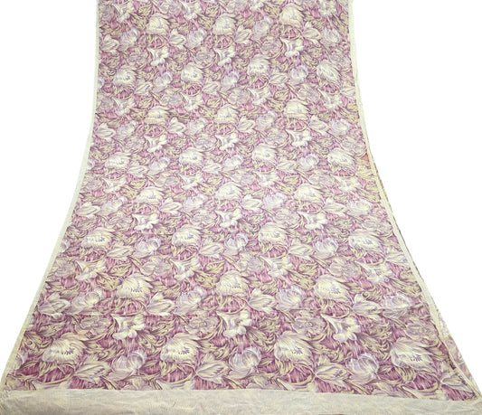Indian Vintage Beige & Purple Saree Pure Crepe Silk Printed Sari Craft Fabric 5yd Sewing Floral Soft Dress making For Crafting Quilting
