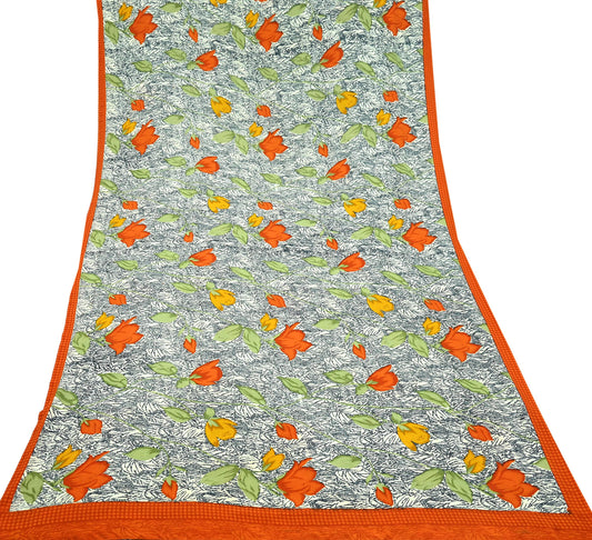 Indian Vintage Sari Gray & Orange Printed Pure Cotton Saree Craft Fabric Soft Floral 5Yd Sarong Wrap Boho Kimono Soft Dress making Quilting