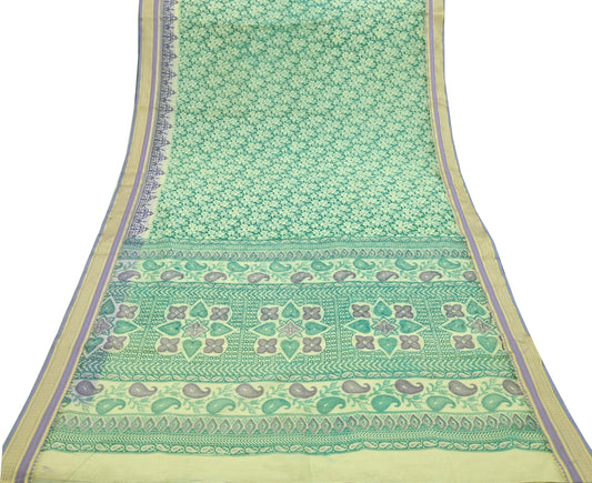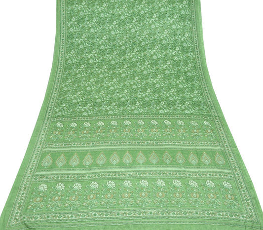 Indian Vintage Green Saree Printed Pure Cotton Sari Craft Fabric 5Yd Soft Sewing Sarong Wrap Boho Floral Upcycle Quilting For Crafting
