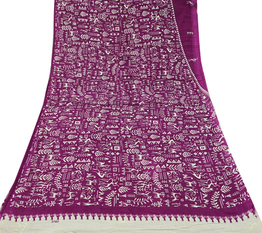 Indian Vintage Sari Purple & Ivory Warli Printed Saree 100% Pure Cotton 5Yd Craft Fabric Soft Sewing Sarong Wrap Quilting Dress Making