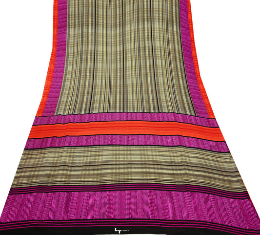 Indian Vintage Beige & Brown Saree Moss Crepe Printed Sari 5yd Sewing Stripes Soft Craft Fabric Dressmaking Quilting Crafting Upcycle