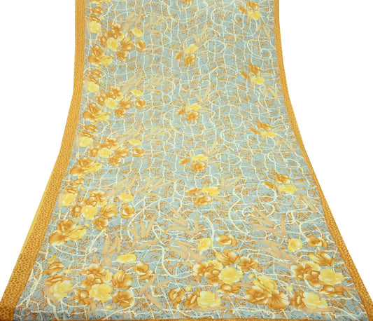 Indian Vintage Mustard & Gray Sarees Moss Crepe Printed Sari 5yd Sewing Floral Soft Craft Fabric DressMaking For Crafting Quilting Upcycle