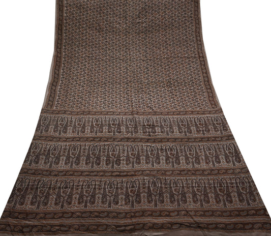 Indian Vintage Brown Saree Pure Crepe Silk Block Printed Sari 5yd Sewing Floral Soft Craft Fabric Wrap Dress Making Crafting Quilting