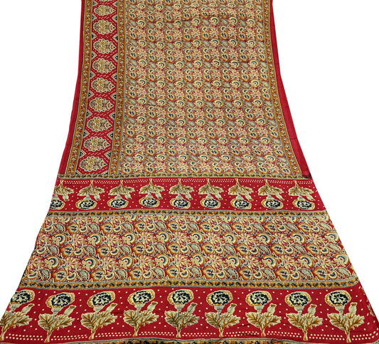 Indian Vintage Red & Beige Saree Printed 100% Pure Cotton Sari Craft Fabric 5Yd Soft Sewing Sarong Wrap Dress Making Quilting Crafting