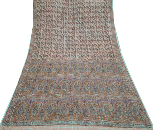 Indian Vintage Sari Beige & Green Pure Cotton Printed Sarees Craft Fabric Soft 5Yd Sarong Wrap Boho Fabric Kimono Quilting Crafting Upcycle