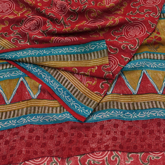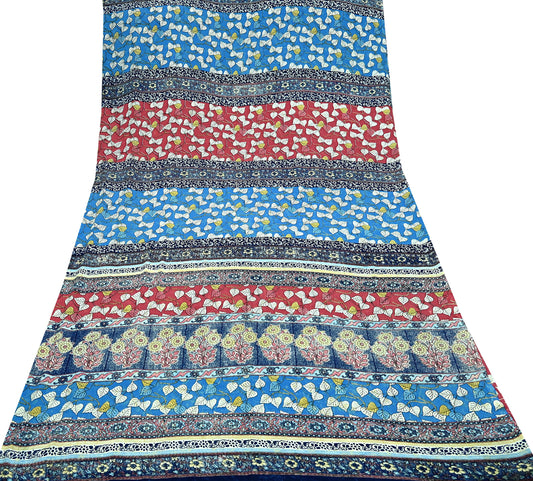 Indian Vintage Red & Blue Saree 100% Pure Georgette Silk Printed Sari Sewing 5yd Craft Fabric Dress Designing for Dress making