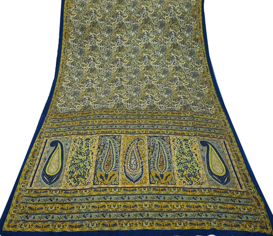 Indian Vintage Mustard & Gray Sarees Moss Crepe Printed Sari 5yd Sewing Floral Soft Craft Fabric DressMaking For Crafting Quilting Upcycle