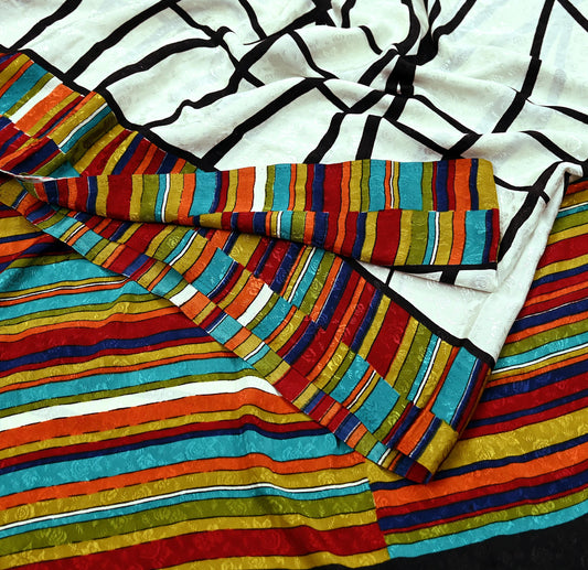 Indian Vintage Saree White & Black Moss Crepe Woven Printed Sari 5yd Sewing Soft Craft Fabric Dressmaking Dress Designing Quilting
