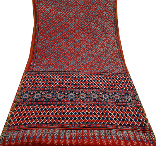 Indian Vintage Sari Red Block Printed Pure Cotton Saree Craft Fabric 6Yd Sewing Sarong Wrap Boho Floral Crafting Upcycle Quilting Zari