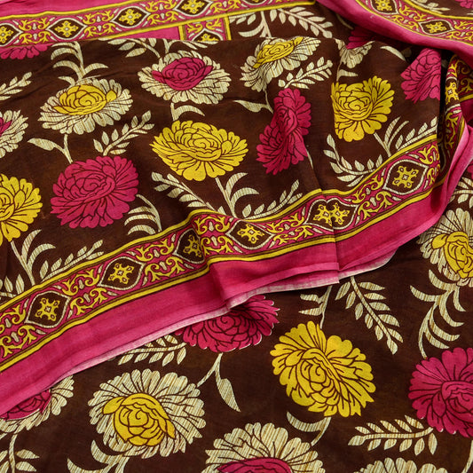 Indian Vintage Sari Brown & Pink Printed Saree Pure Cotton Craft Fabric Soft 5Yd Sewing Sarong Wrap Boho Floral Dress Making Quilting