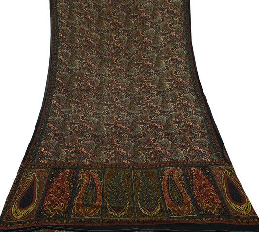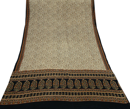 Indian Vintage Beige & Black Saree Pure Crepe Silk Printed Sari Craft Fabric 5yd Sewing Floral Soft Wrap Dress making Crafting Quilting