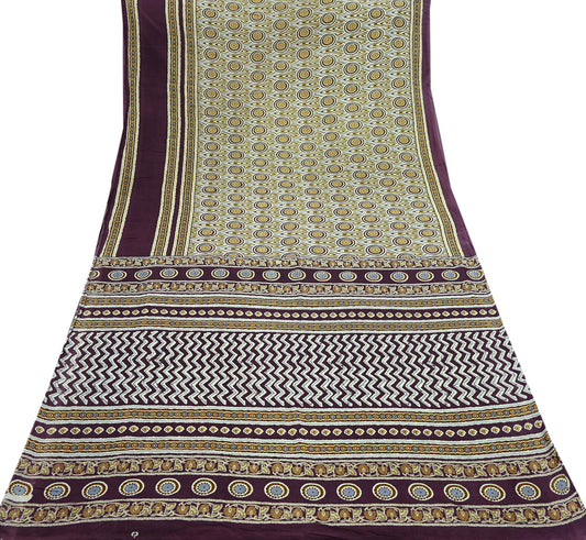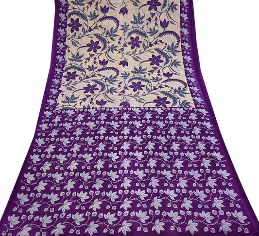 Indian Vintage Sari Beige & Purple Pure Cotton Printed Sarees Craft Fabric Soft 5Yd Sarong Wrap Boho Fabric Kimono Quilting Crafting Upcycle
