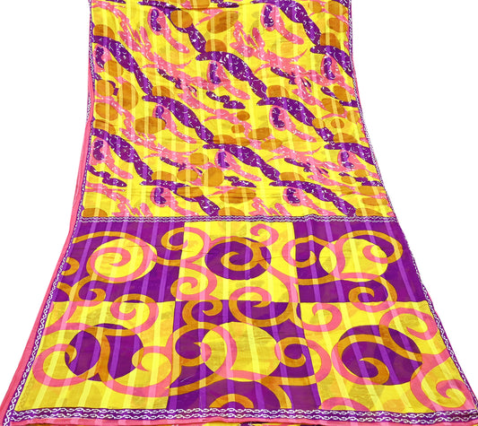 Indian Vintage Sari Purple & yellow Printed Sarees Pure Cotton Craft Fabric 5Yd Soft Sewing Sarong Wrap Boho Upcycle Quilting Crafting Used