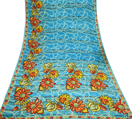 Indian Vintage Blue Saree Moss Crepe Printed Sari 5yd Sewing Floral Soft Craft Fabric Dressmaking For Crafting Quilting Upcycle Boho
