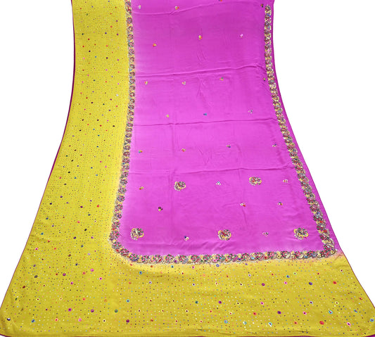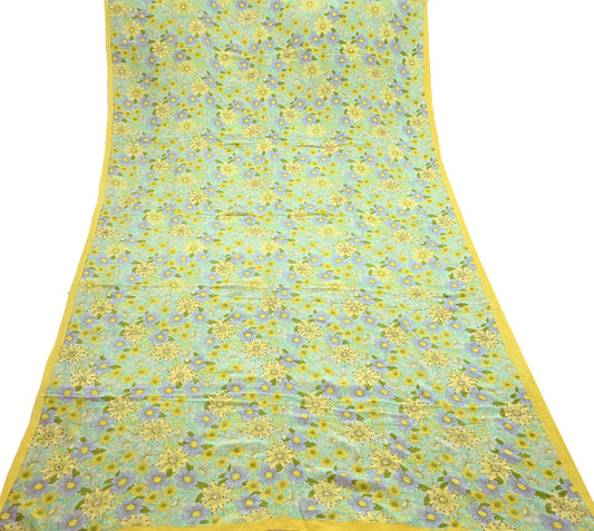 Vintage Green & yellow Pure Crepe Silk Saree Hand Embroidered Floral Fabric 5Yds Indian Dressmaking, Quilting Craft Material
