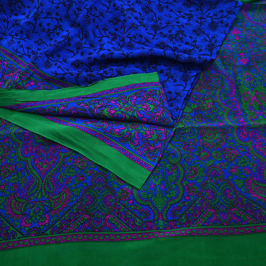 Indian Vintage Sari Blue & Green Pure Crepe Silk Printed Saree 6yard Sewing Floral Soft Craft Fabric Wrap