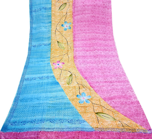 Indian Vintage PInk & Blue Pure Crepe Silk Saree Floral Print 5 Yards Soft Sewing Fabric for Dressmaking, Quilting, Crafting Upcycling