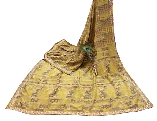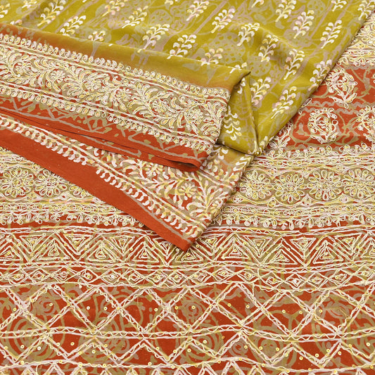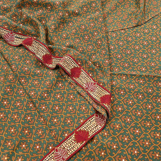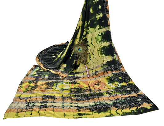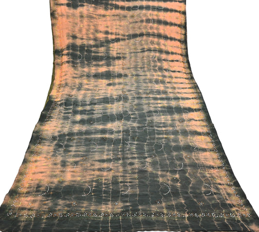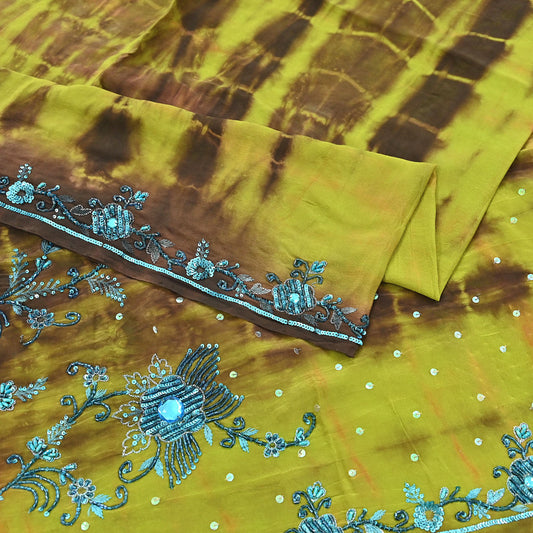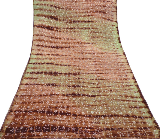 Indian Vintage Brown & Green Saree Pure Crepe Silk Hand Embroidered Tie-Dye Sari Fabric 5yard Sewing Craft Fabric Ethnic zari